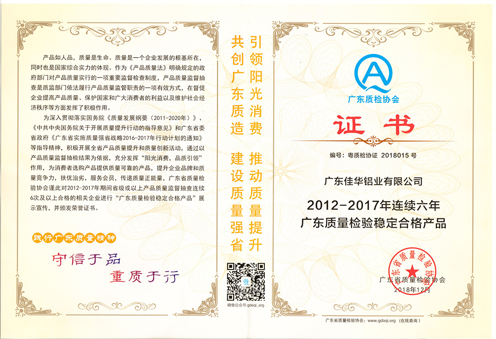 2018年12月,佳華鋁業(yè)再次榮獲“2012-2017年連續(xù)六年廣東質(zhì)量檢驗(yàn)穩(wěn)定合格產(chǎn)品”證書,體現(xiàn)了行業(yè)對(duì)于佳華鋁業(yè)產(chǎn)品質(zhì)量的認(rèn)可。