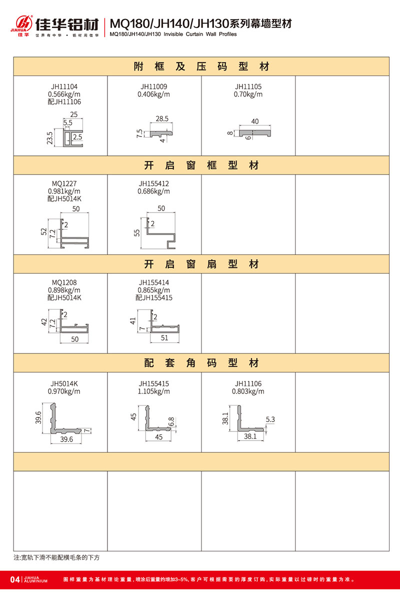 鋁型材規(guī)格型號:MQ180/JH140/JH130 B